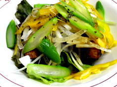 ピーマン、アスパラガスを散らし、ドレッシングを回しかける |