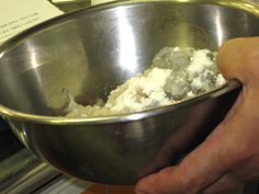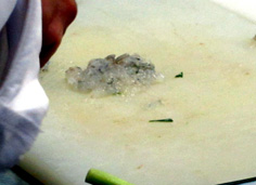ボールに小エビ、帆立、豚の背脂を入れて良く練る。全体に粘りが出たら、具の味付けの調味料を加える |