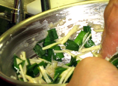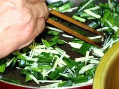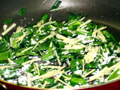 ニラとたけのこは少しの油で、半生程度に炒める |