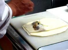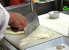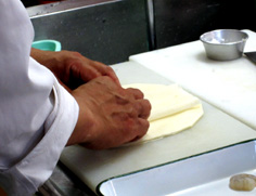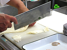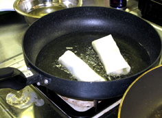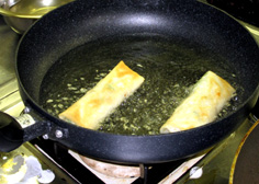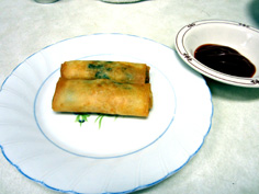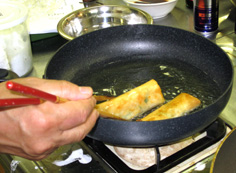 手前から巻いてゆく。ふんわりと巻くのがコツ。揚げた時に、油が中心まで通り、全体の皮がパリッとする |