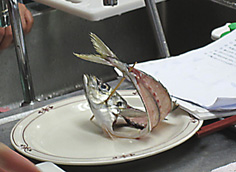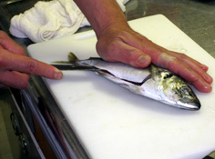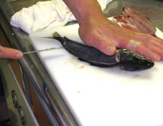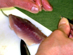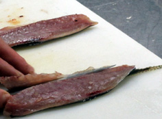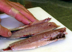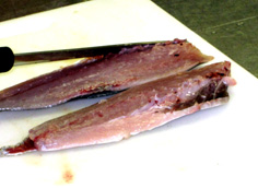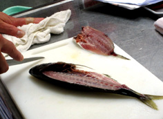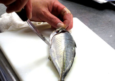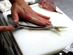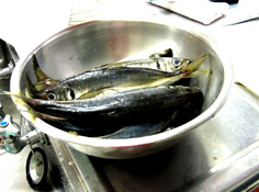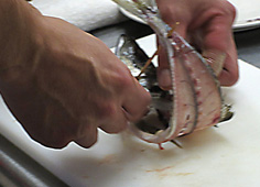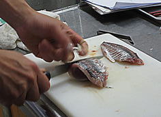 鯵は胸びれの下から腹のところまで庖丁を入れる。 |