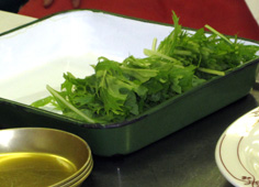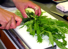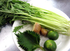 大葉 12枚(内 飾り用4枚) ネギ 1/4本 ショウガ 少々 水菜 1/3束 すだち 1個 |