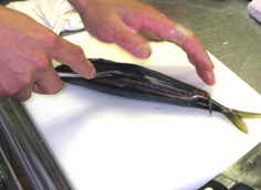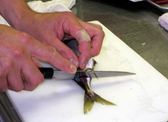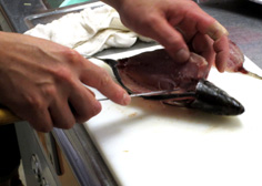 ぜいごを尾の方から2~3cm庖丁を入れるが、切り落とさない。その下に切り目を入れておく |