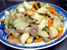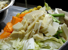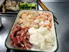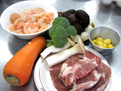 材料 6人分 A 豚肩ロース(厚さ5ミリ) 60g エビ(ブラックタイガーむき身) 12尾 いか(紋甲いか)胴体分 1枚 B 白菜 2~3枚 たけのこ 1/4本 干し椎茸 6枚 人参 1本 アスパラガス 3~4本 ウズラの卵 6個 ギンナン 12個 ブロッコリー 1/2個 エリンギ 4本 ※ネギの微塵切り 少々 |