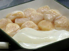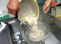 同じお湯にえび、帆立、いか、豚肉を入れ湯通し |