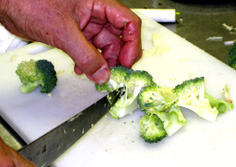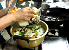 たっぷりのお湯を沸かし、バットの野菜類を入れる。ここでは油通しではなく、湯通しをする方法 |