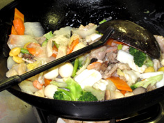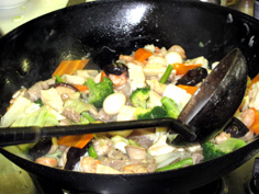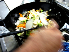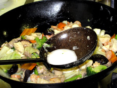 ネギの香りが出たら、エビ、帆立、いか、肉を入れて軽く混ぜ |