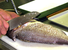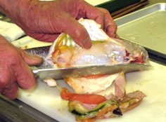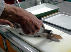 腹に庖丁を入れ、内臓を取り出す |