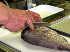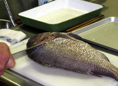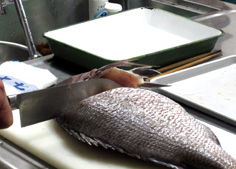 鯛のうろこは硬いので、うろこ引きで丁寧に取る |