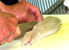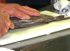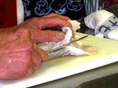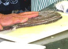 皮を下にして、尾の方から内側に向けて引く。これは、内引きと言う |