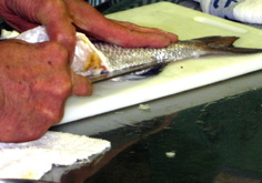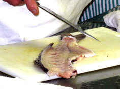 胸びれを持ち上げて、その下に庖丁を入れる |