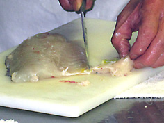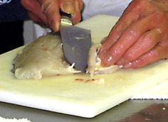 骨の上に沿わせて奥まで庖丁を引く |