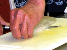 最後に庖丁を直角に立てると、綺麗に切れる |