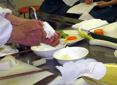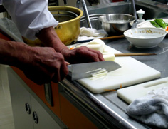 右手の庖丁だけを斜めに下に向けて下ろす。これを梨割りと言う |