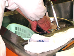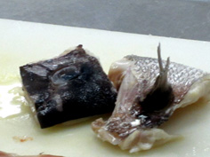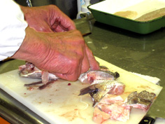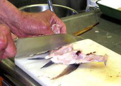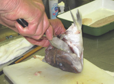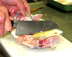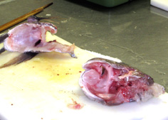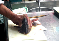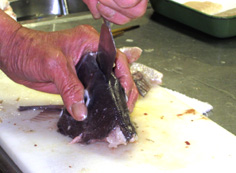 頭は口が左手に来るように置く。動くと危険なので俎板にしっかり置き支える。上から庖丁を刺し |