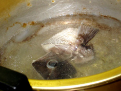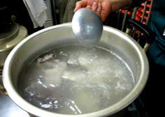 残りの粗は薄塩を振り、鍋で潮汁を作る。アクを丁寧に取り、酒と塩で味を整え、最後に醤油をタラっと垂らす |