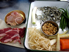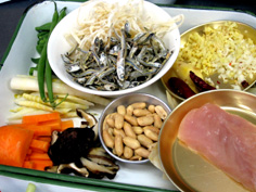 材料 4人分 豚肉 60g 鶏胸肉 60g サキイカ 30g 煮干 30g ピーナッツ 50g ※合わせ調味料 酒・醤油 各大さじ3 砂糖 大さじ2 水飴 大さじ1 五香粉 少々 |