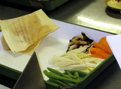 いんげんは、長さを半分に、人参はいんげんと同じ大きさ。干し椎茸は水気を絞り細切り、細竹は回し切り |