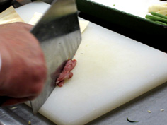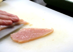 鶏胸肉は薄く広げてから、繊維に斜めに切る |