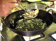 干し椎茸は水気が多いので、二度揚げをしてカリッとさせる |