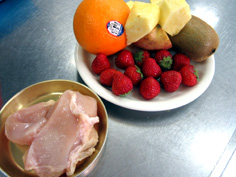 材料 4人分 御飯 500g りんご、苺、パイナップル(フレッシュ)、キウイ、オレンジ、鶏胸肉、エビ 全て50g 鶏がらスープ 150cc ※調味料 塩 小さじ1/3 砂糖 小さじ1強 酒 大さじ1 ミリン 大さじ1 コショウ 少々 水溶き片栗粉 大さじ2 |