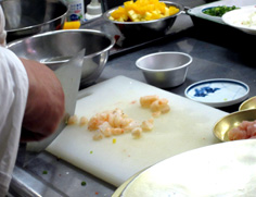 りんごは皮をむいたら、水につけておく。果物とエビ、鶏胸肉は全て1cm角にする |