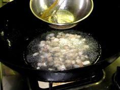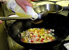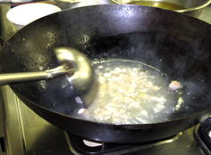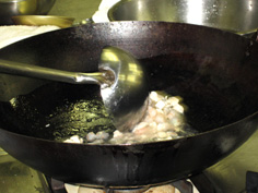 中華鍋で、エビと鶏胸肉を炒める |