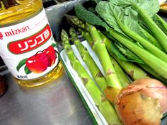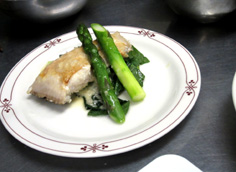 材料 4人分 (家庭ではソースを下の倍量で作ると良い) エシャロット 40g(玉ねぎなら倍使う) りんご酢 80cc 白ワイン 100cc(80ccと20ccに分ける) 生クリーム 20cc 無塩バター 100g 小松菜 アスパラガス |