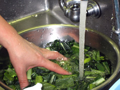 ザルを被せて、しばらく水を流しておく。野菜がピンとする |