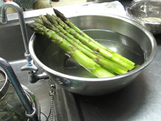 アスパラガスは硬い皮をピーラーでむき、水につけておく |