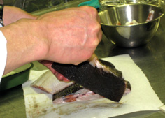 ここで余分な油はふき取る。皮と身の間のあぶらは生臭いので皮をパリッとさせる |