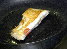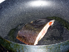 フライパンにオリーブオイル少々を引き、ここでは身の方から焼く。ここで初めて火をつける。最初は強火、チリチリ音がしてきたら中火 |