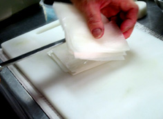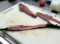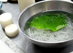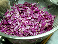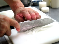 食べ易いおおきさに切る。酢と砂糖を混ぜた中に漬け、表面が白くなったら取り出す。 |