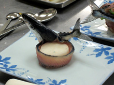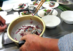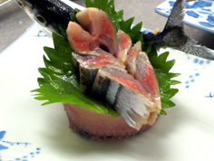 食べる直前に菊の水気を絞りさんまとあえ(隠しに醤油少々をたらす)、盛り付ける |