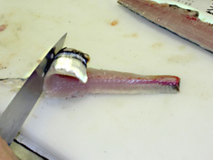 身は、腹骨をすき取り、頭の方から皮を引く |