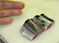 はらわたを取り、良く洗う。三枚におろしたら、小骨を取り塩少々をあてる。馴染むまで少しおく |