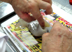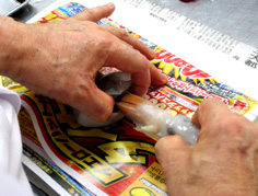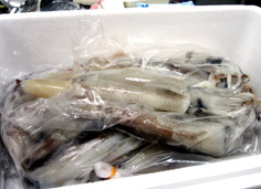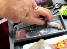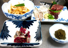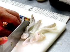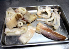 足先を落として2本くらいに切り分け、軽く霜降りしてさんまの刺身と一緒に盛り付ける |