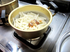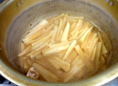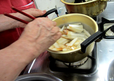 火をつけ、かき混ぜながら大根に火を通す。 |