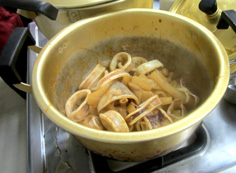 大根が柔らかくなり、水気が少なくなったらいかを加えて煮る。いかの身が固くならないうちに火を止める |