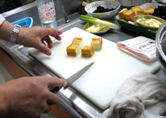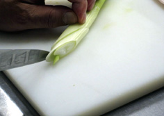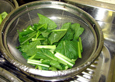 小松菜を3〜4センチに切り、水洗いしてザルにあげておく |