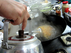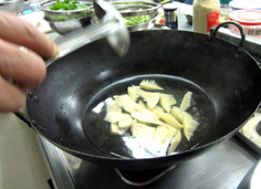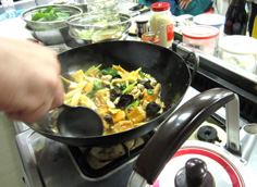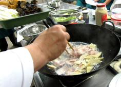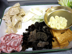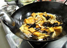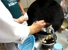 ザルに取っておいた厚揚げ、豚肉、キクラゲを入れる |