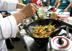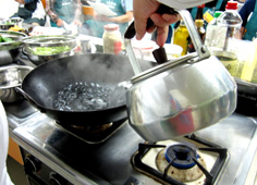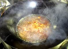 中華鍋にサラダ油大さじ2〜3を入れ、豆板醤とニンニクを弱火で香りが出るまで炒める。お湯を加える |