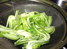 葉と茎は洗ってザルに取る |
