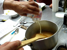 鍋に戻し、再び煮つめ、塩と白コショウで味をつけ、火を止めてから無塩バター80gでモンテし、仕上げにシブレットを入れる |