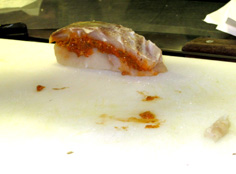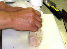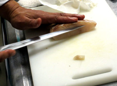 平目の上から1/4のところに庖丁を入れ、開く。切り落とさない |