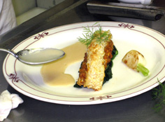 表面に焦げ色がつくように焼き、皿にほうれん草を敷き、その上にのせる。かぶを置き、ソースを流す。ディルを飾って完成!! |