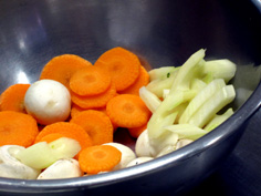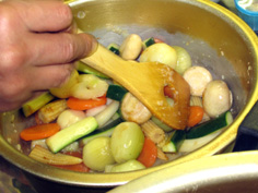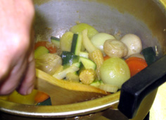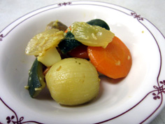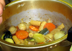 材料 5人分 プチオニオン 5個 人参 1本 セロリ 1本 ヤングコーン(缶詰) 5本 シャンピニオン(マッシュルーム) 5個 ズッキーニ 1個 ニンニク 1個 オリーブオイル 20cc 白ワイン 50cc ビーフコンソメ(粉末) 1本半 カレー粉 少々 |
