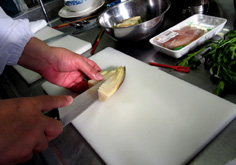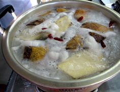 竹の子を、たて半分に切り大根おろしと唐辛子を入れて茹でる。大根おろしで茹でると、アクが取れて、甘みも出る |