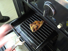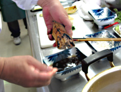 醤油とだし汁を合わせ、割り醤油を作っておく。グリルを熱し、皮目から焼く。皮目がキツネ色になったら返し、割り醤油を塗って、さらに焼く。2〜3回塗る |