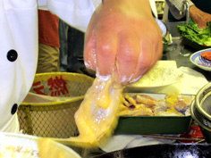 衣用の、卵と小麦粉と片栗粉を良く混ぜ、鶏手羽にたっぷりまぶす |